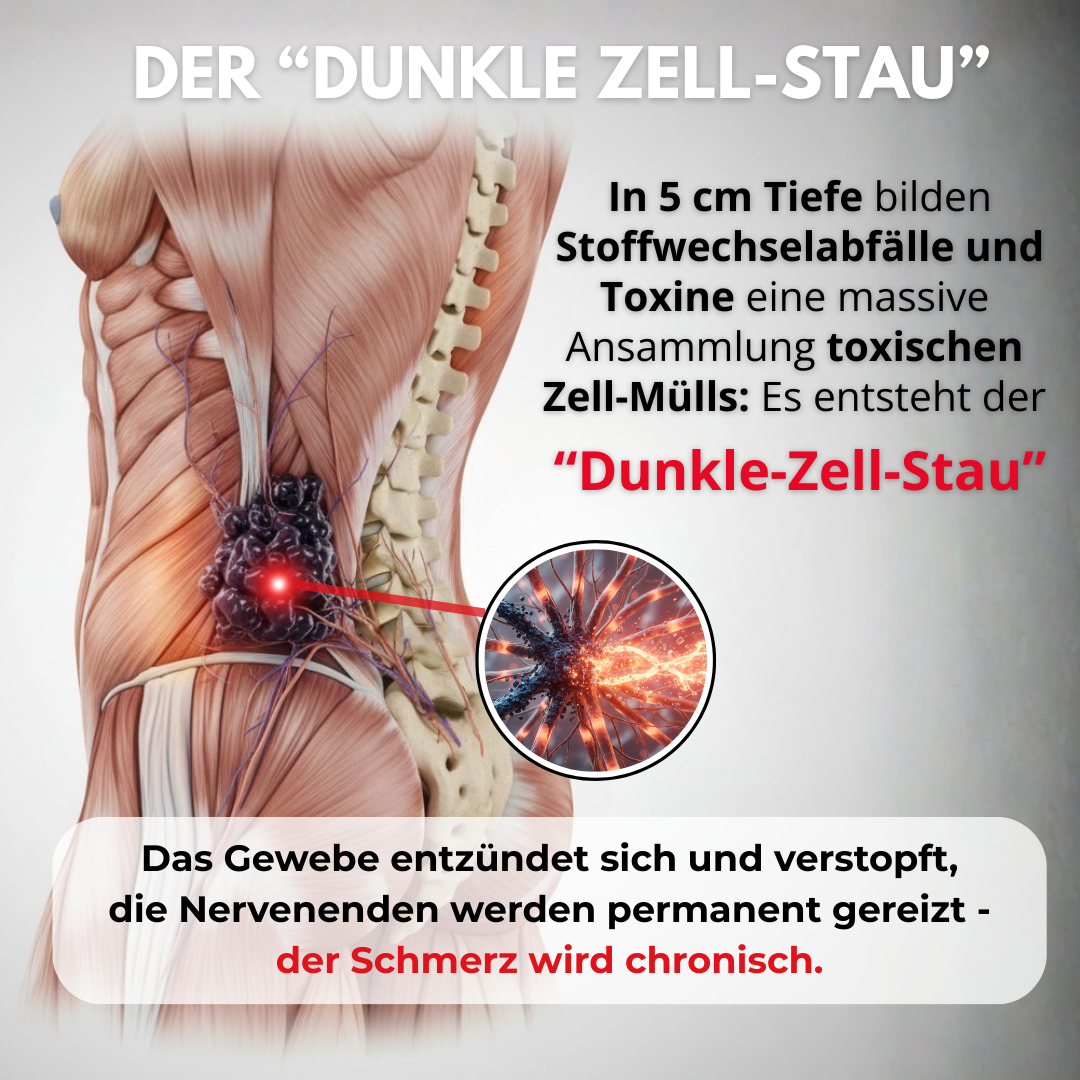 Die moderne Schmerzforschung zeigt: Chronische Rückenschmerzen entstehen meist nicht durch reinen Verschleiß oder wegen des hohen Alters. Die wahre Ursache liegt in Wirklichkeit viel tiefer – etwa 5 cm unter der Haut - wo ein toxischer Stillstand im Gewebe entsteht. Doch wie kommt es dazu?