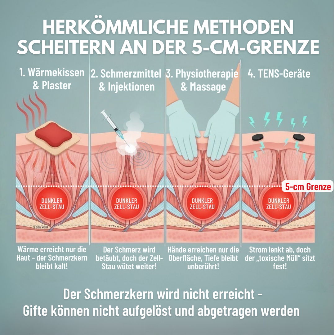 Nach all den Versuchen fühlst du dich vielleicht müde und entmutigt. Doch es gibt eine simple Wahrheit: Keine der üblichen Methoden kann den entscheidenden physikalischen Punkt in 5-cm Tiefe erreichen, in dem der Schmerz entsteht: